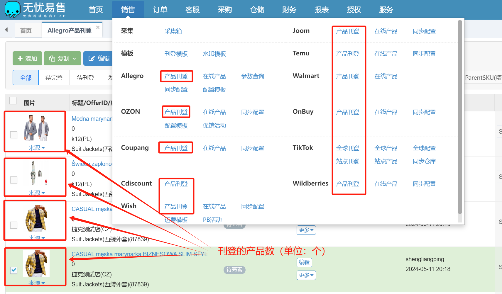 在无忧易售授权的各个平台店铺刊登产品时记录存储刊登的产品信息数据,每个平台独立计算刊登数量(计数单位:个)。