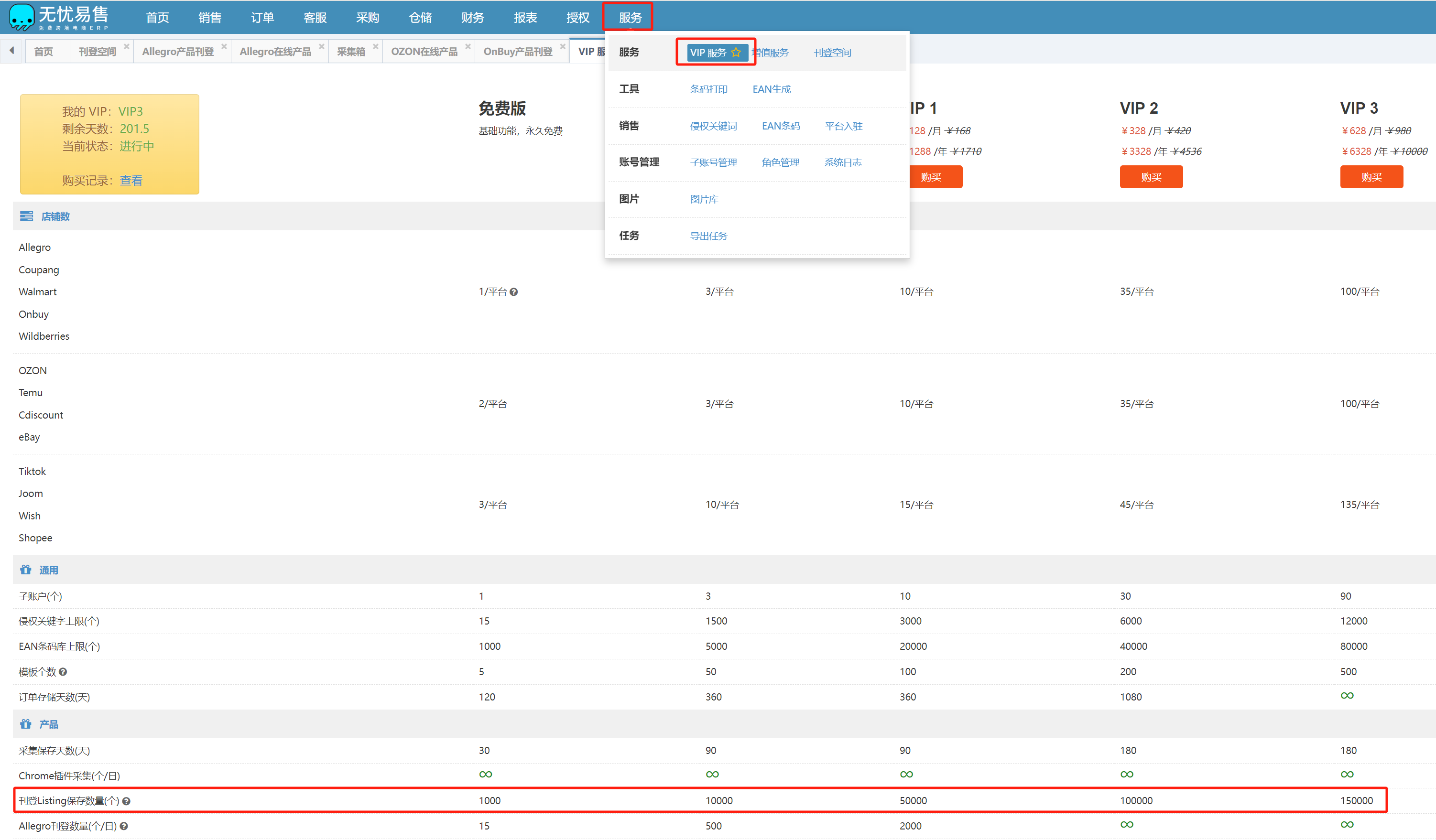 2、购买增值服务-刊登空间:免费版存储的刊登数量1000(单位:个),可根据具体自身需求购买VIP服务扩展刊登包数量或购买刊登空间中购买扩展数量;