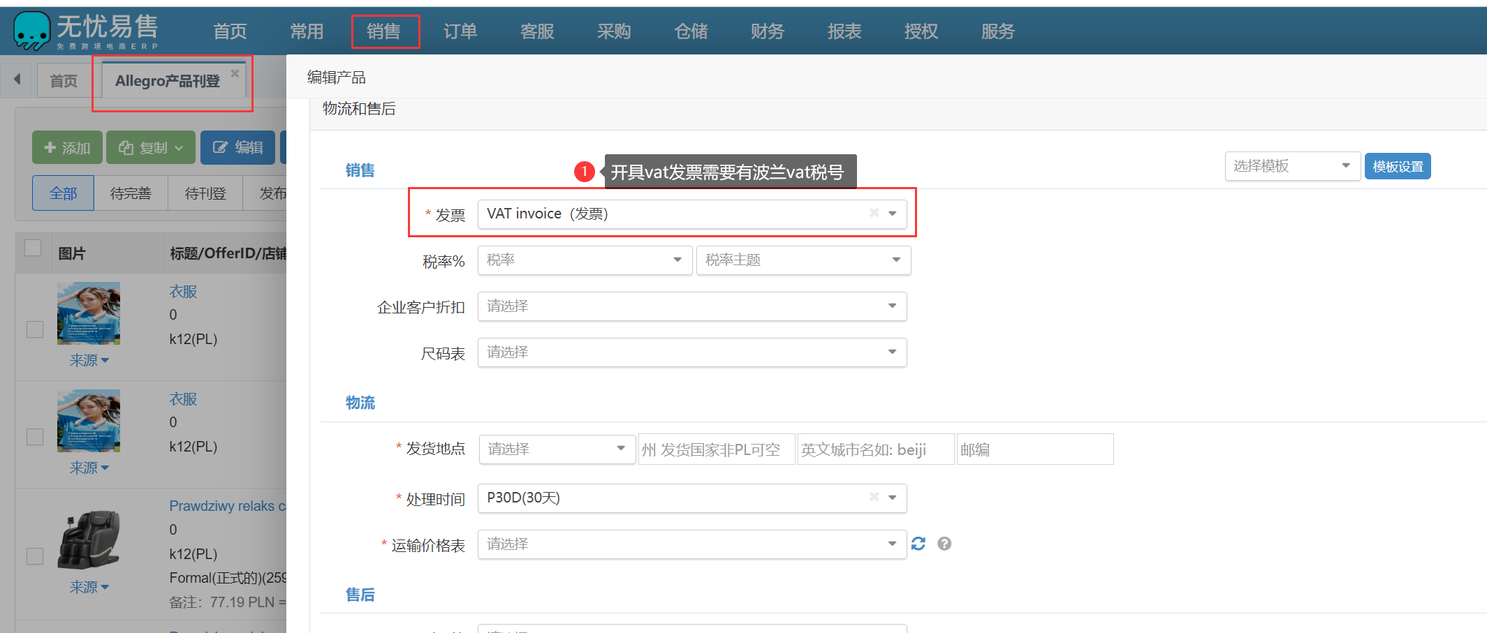 1.Allegro产品刊登页面刊登产品时选择上开发票选项;