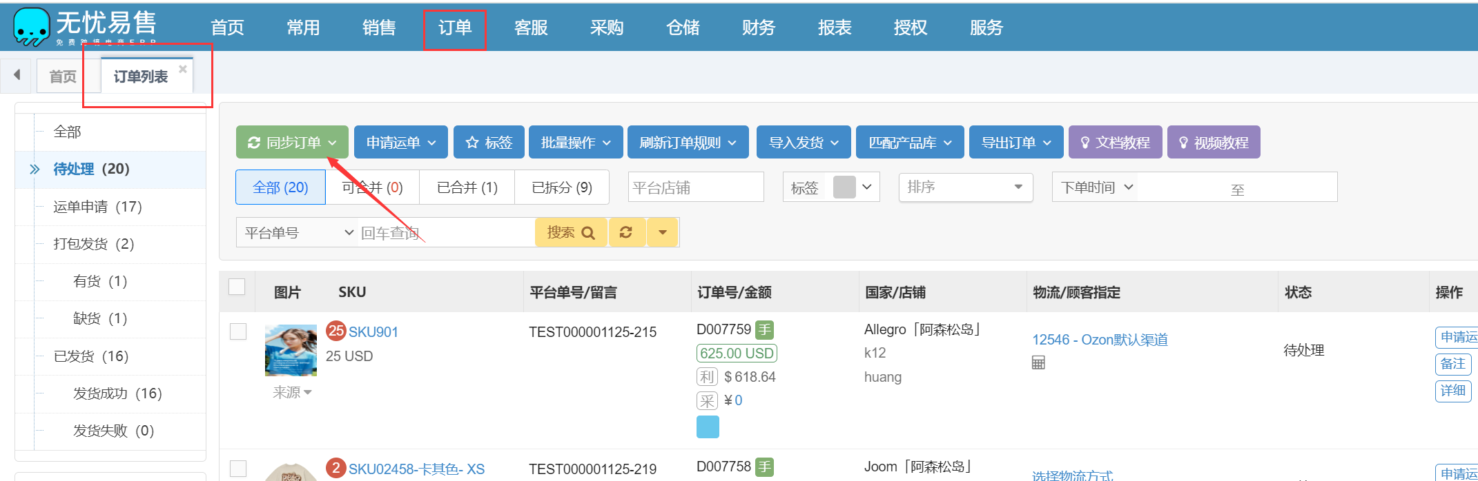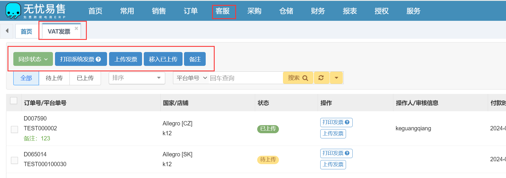 2. 在订单列表页面,点击同步订单,如同步到订单状态是需要开发票的会进入如到vat发票中;