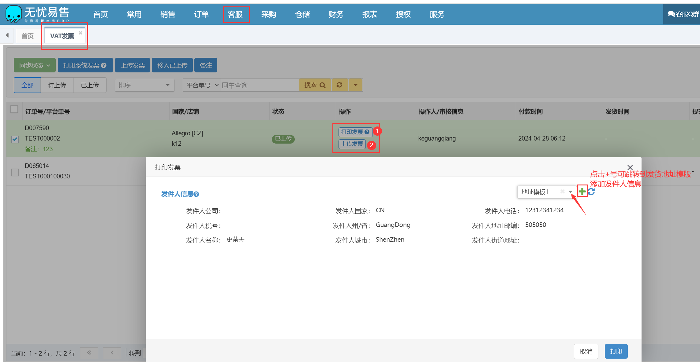 3.在客服-vat发票页面,点击打印发票选择发件人信息后打印,打印完成后点击上传发票。