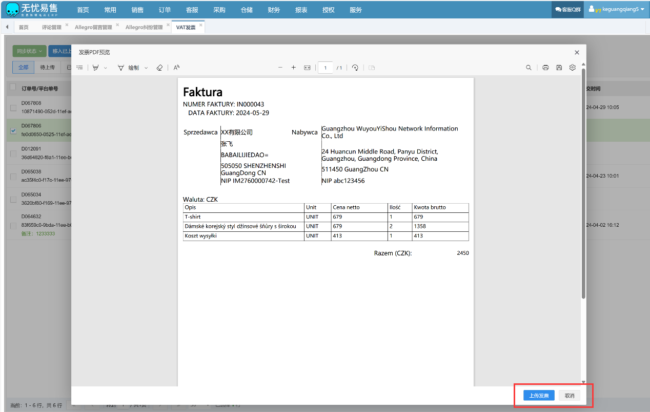 (3)上传发票:打印发票后可点击上传发票到allegro后台;
