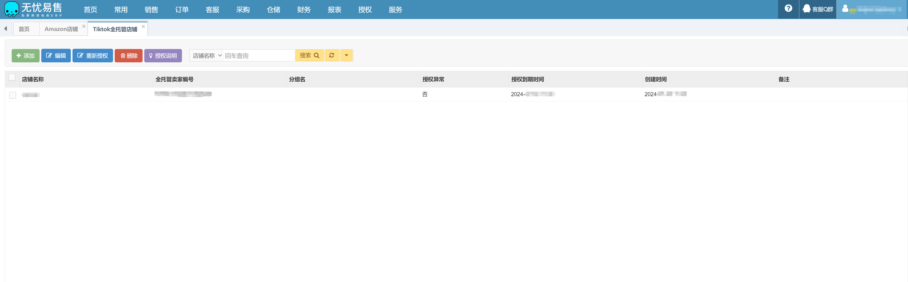 【第一步】登录无忧易售,打开【授权】-【全球】-【Tiktok全托管店铺】,点击【按钮】,如下图