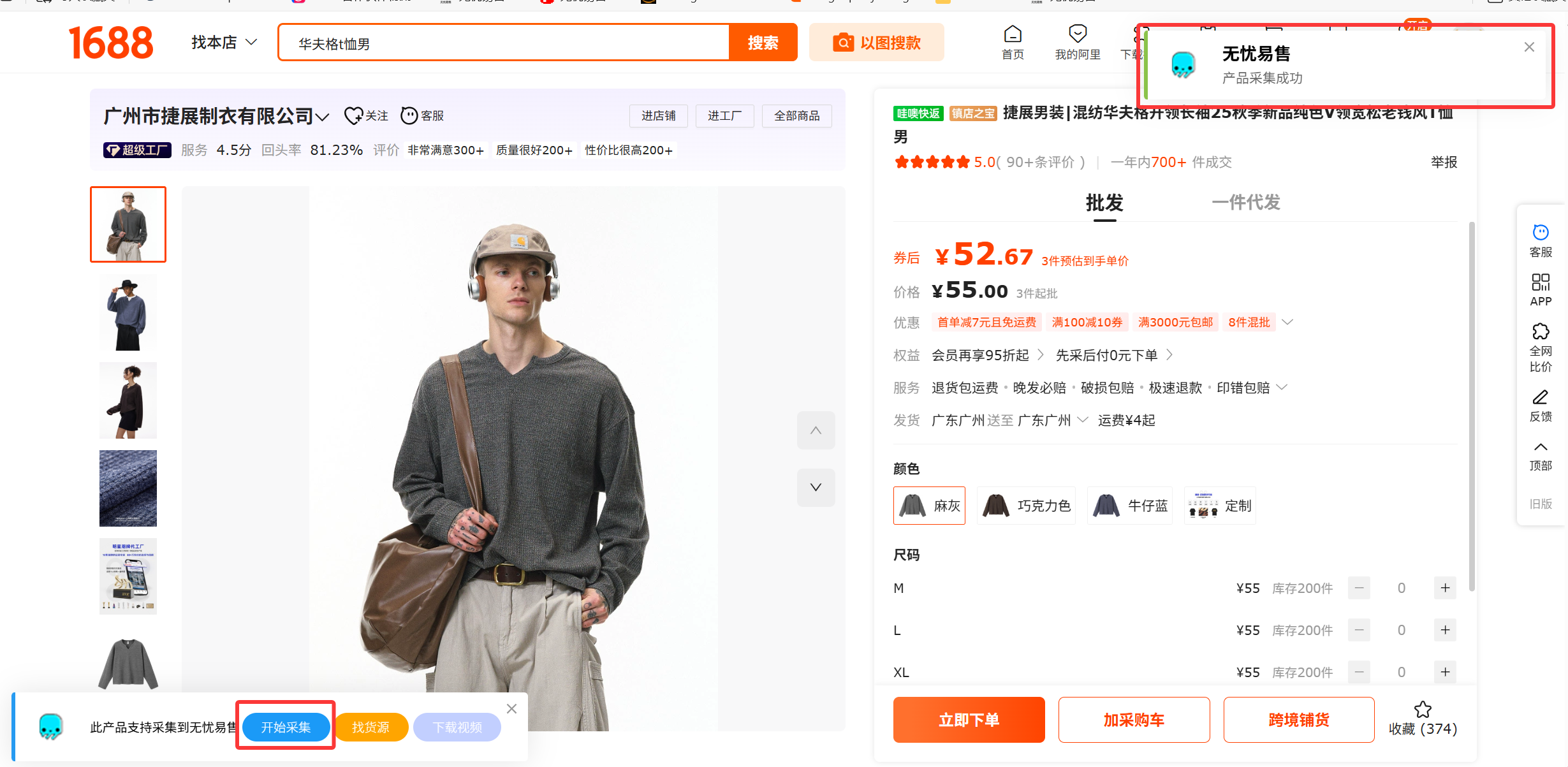 1、在ERP-销售-采集箱-安装采集插件后,进入想要采集的产品详情页面左下角点击【开始采集】,看到右上角出现“产品采集成功”即可;点击查看插件安装教程
