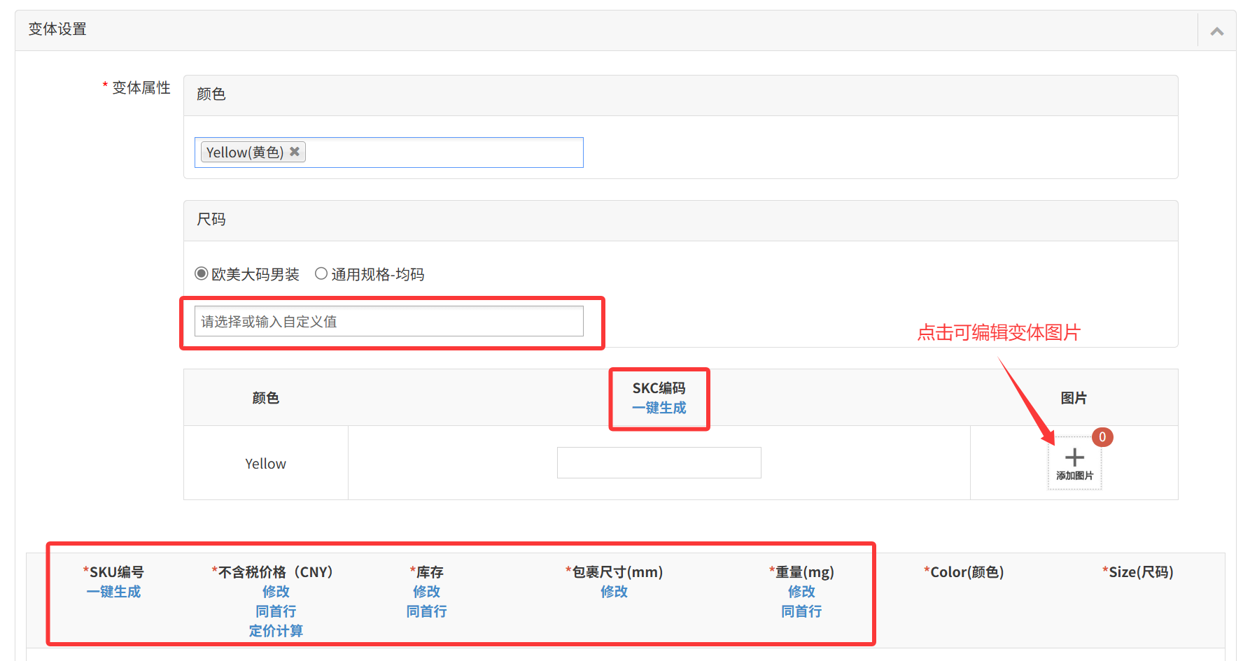 2)skc编码:用于标识商品品类或款式的代码,可使用字母+数字组合,也可直接使用【一键生成】,以Parentsku+变体属性一键生成;(编号中不允许有中文)