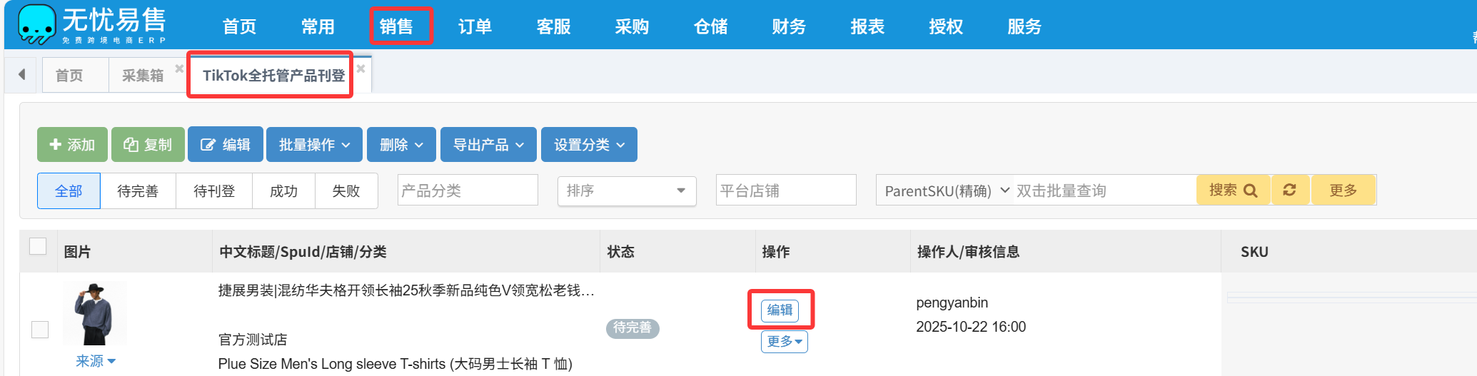 1.在销售-TikTok全托管产品刊登页面,点击编辑产品信息。
