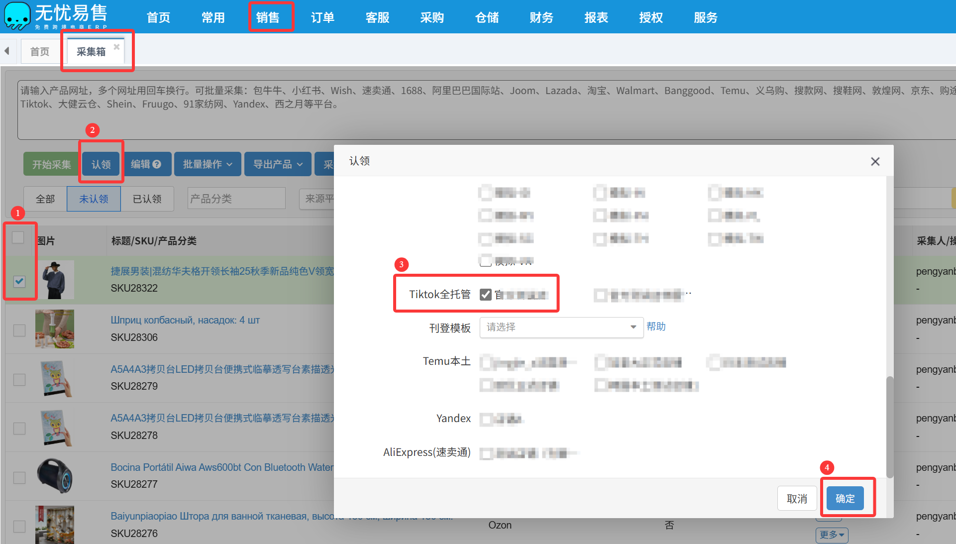 2、对于采集成功的产品,可以到ERP-销售-采集箱页面,勾选产品认领到TikTok全托管已经授权的全托管店铺。