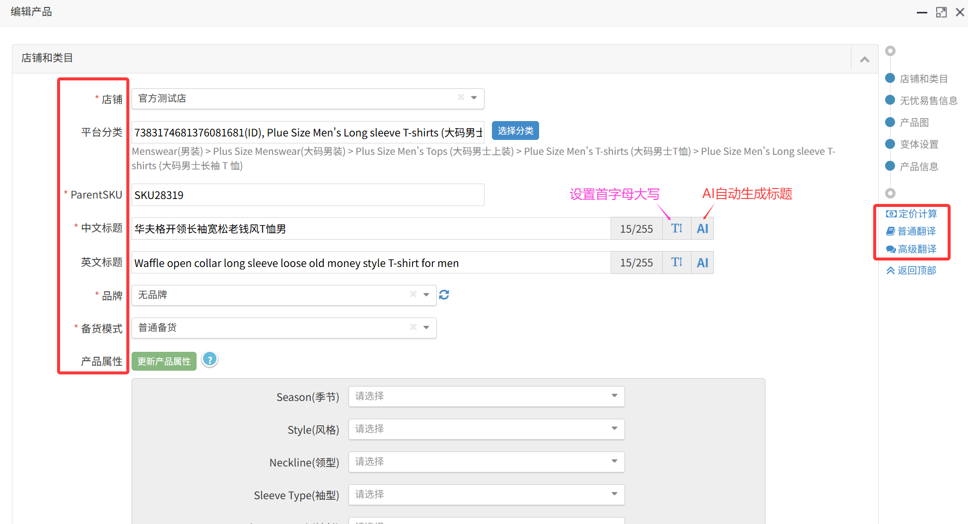 10)普通翻译/高级翻译:可将标题、属性、描述的中文一键翻译成英文;