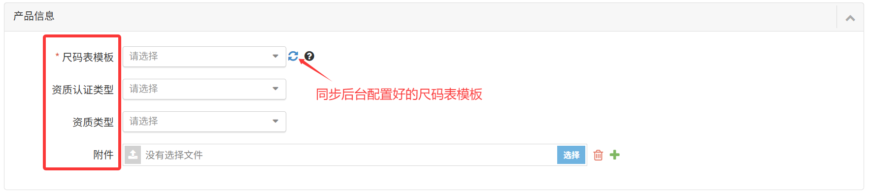 1)尺码表模板:需在店铺后台配置好尺码表同步后选择对应的尺码表;