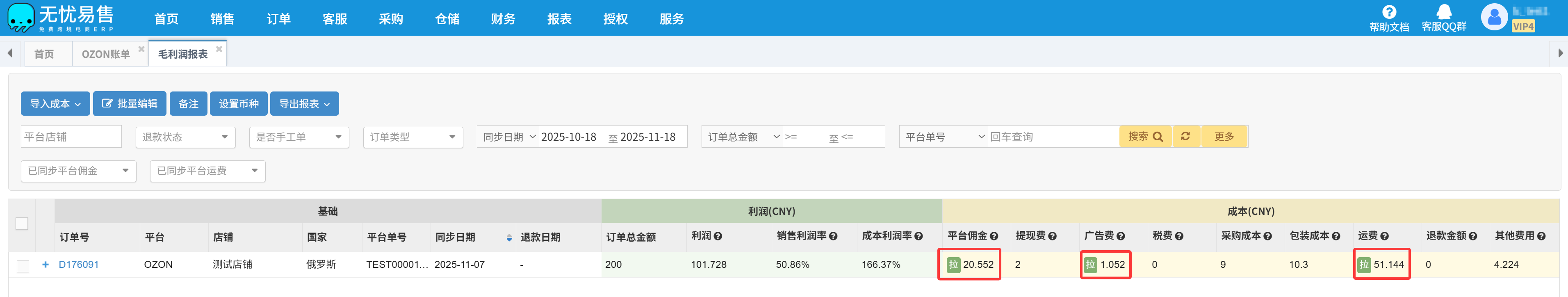 A:在无忧易售 ERP 的毛利润报表中,所有从 OZON 账单自动同步的费用字段旁,都会显示一个 “拉”标识,表示该金额是由系统从平台账单中自动拉取并归类的实际发生费用。