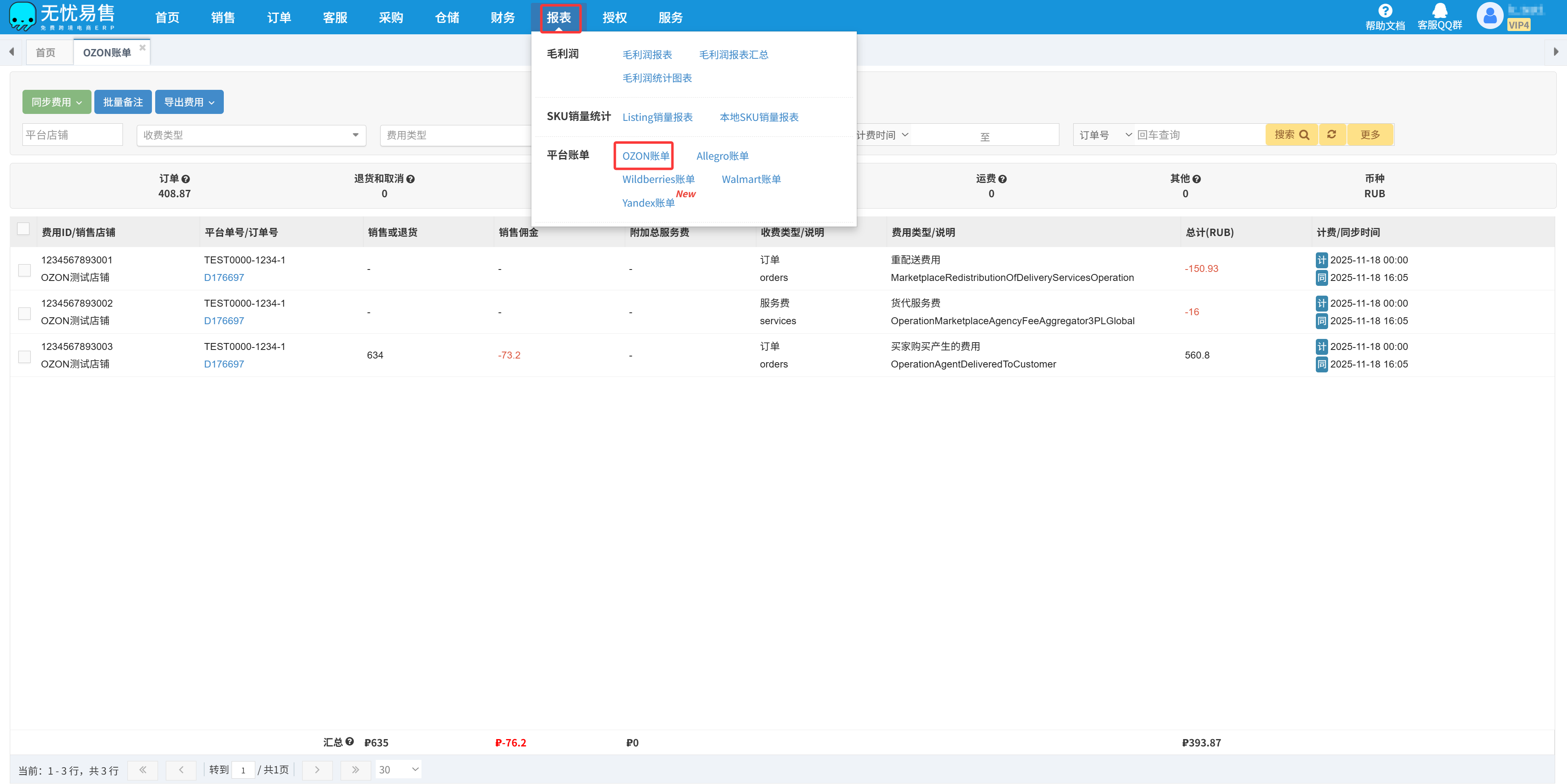 进入OZON账单页面:无忧易售ERP-平台账单-OZON账单