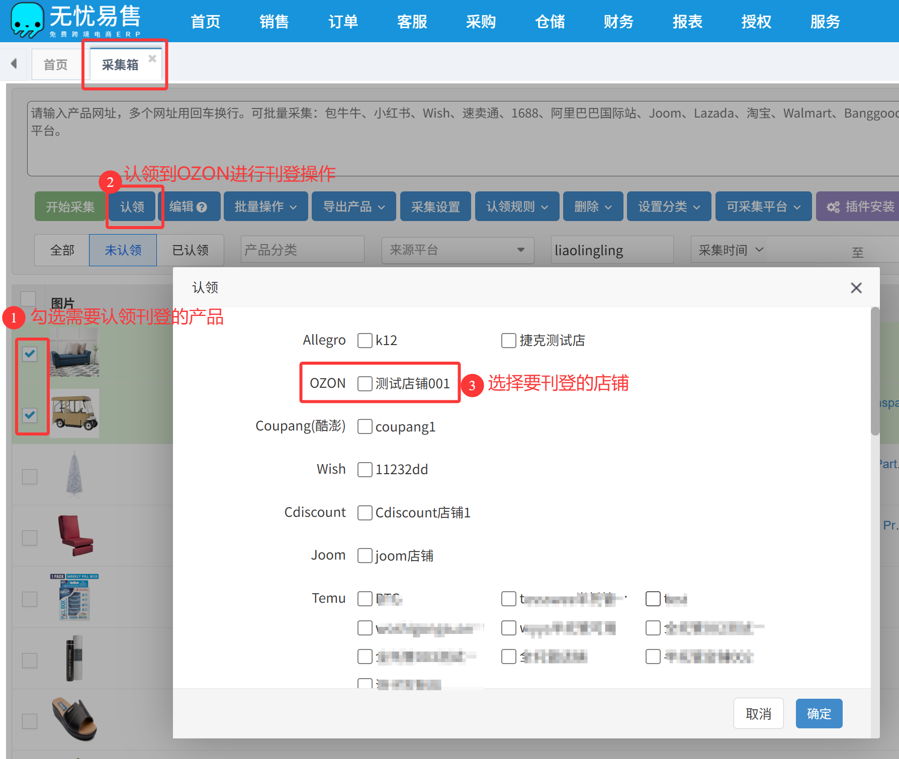 2.回到ERP,进入销售-采集箱进行产品认领到对应店铺。