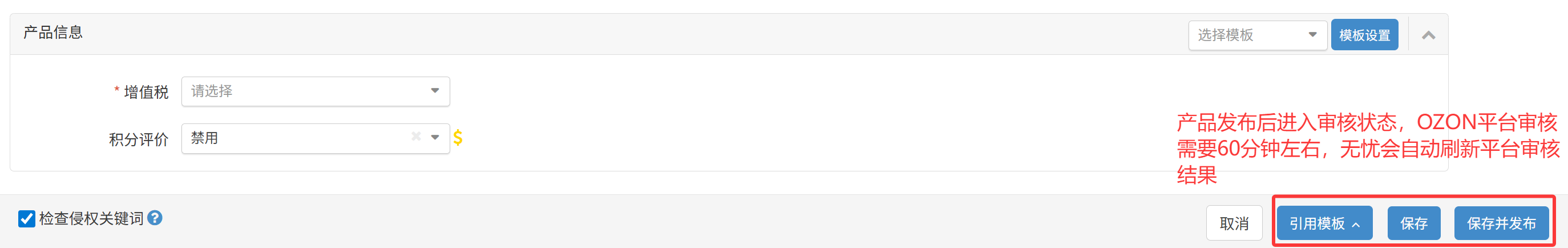 (3)引用模板:可以引用刊登模板快速复用同类刊登产品属性信息;