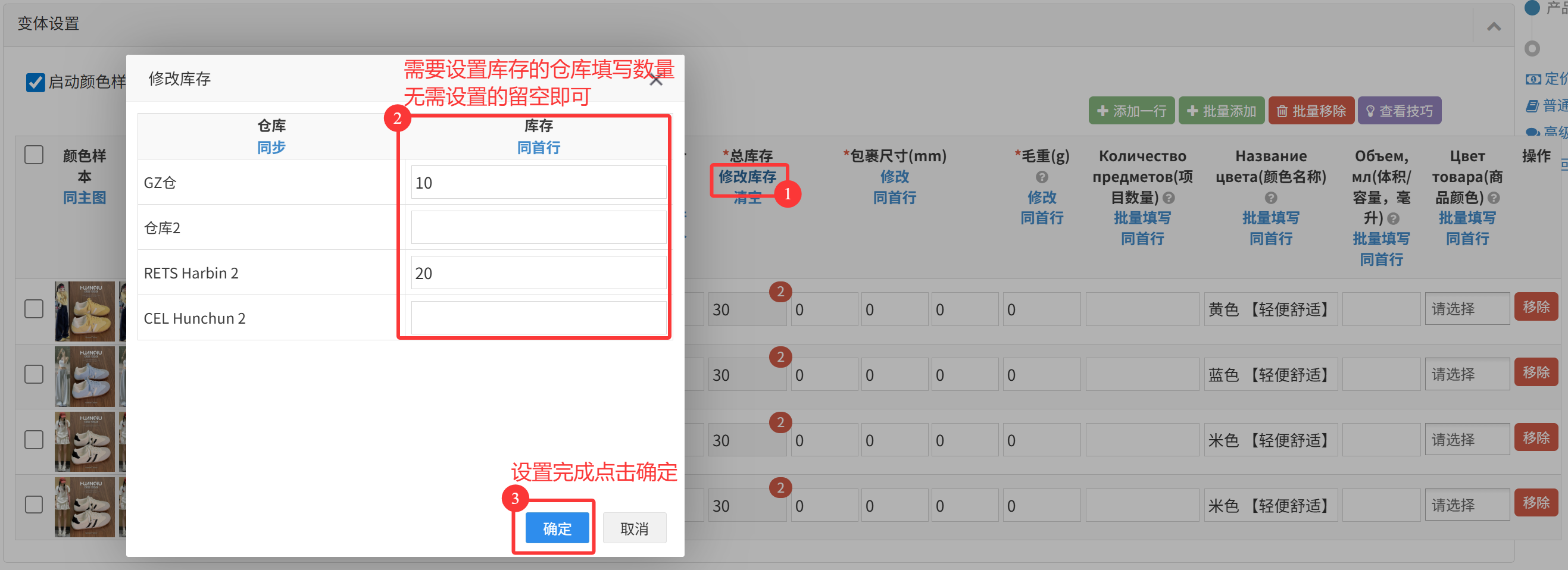 (7)总库存:支持按照仓库设置库存,可使用【修改库存】批量快速设置统一库存;(若在认领时设置了默认库存,ERP会将此库存默认填充到非禁用的所有仓库中)