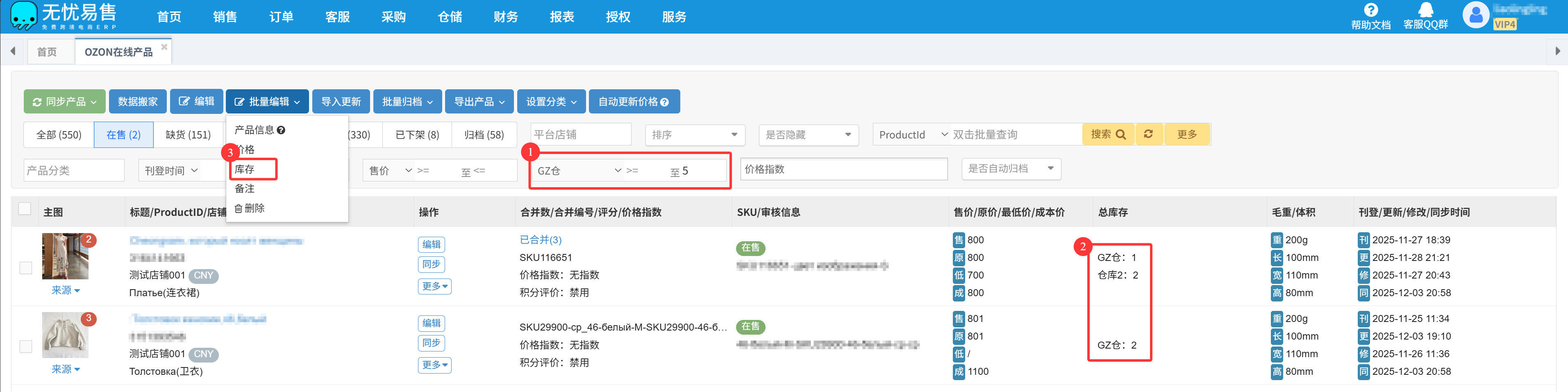 A2:步骤一:可在Ozon在线产品页面,按仓库筛选剩余库存小于或等于安全库存的产品;