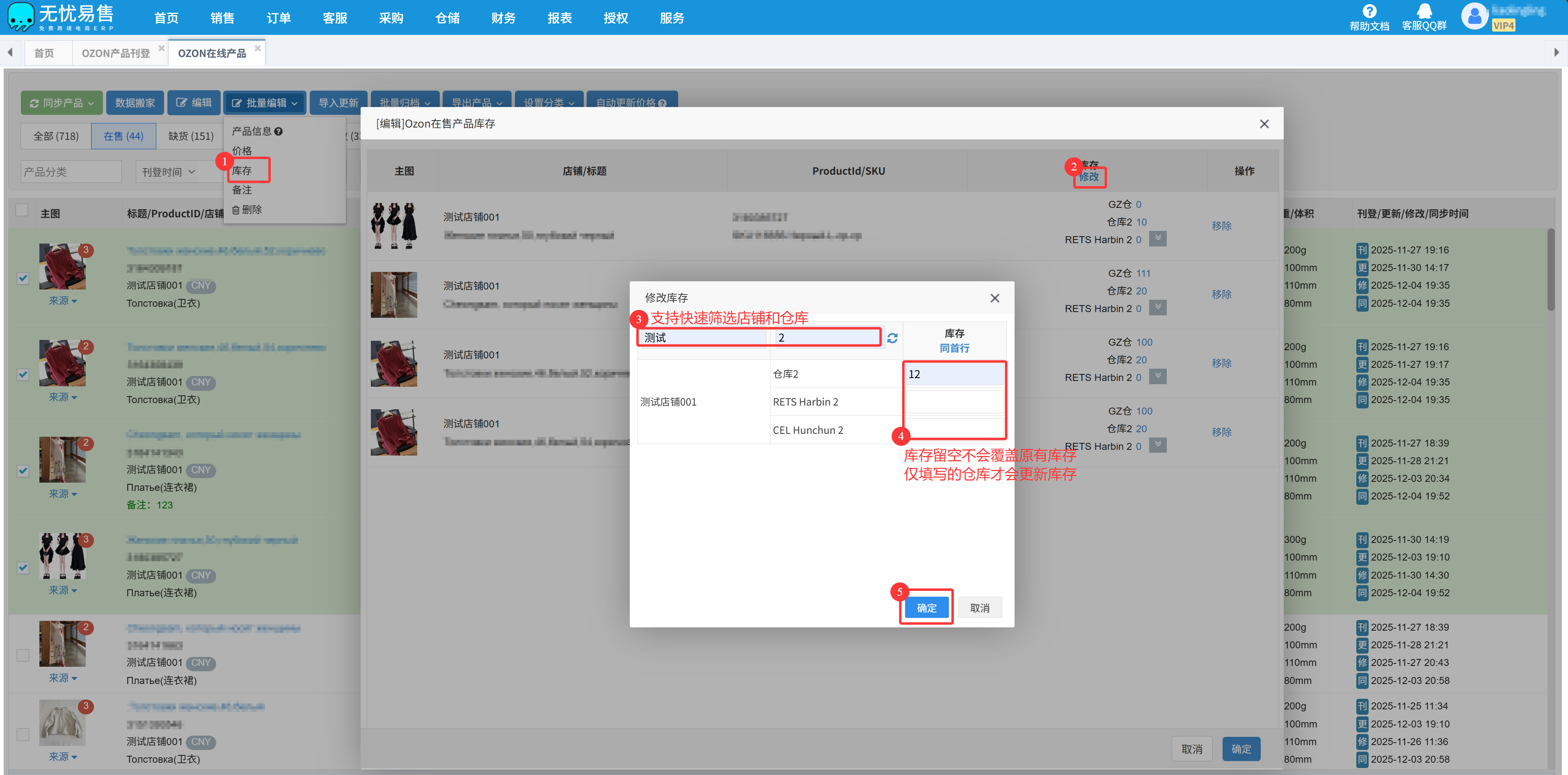 步骤二:再通过【批量编辑库存】功能为这些即将缺货的产品快速补充库存;