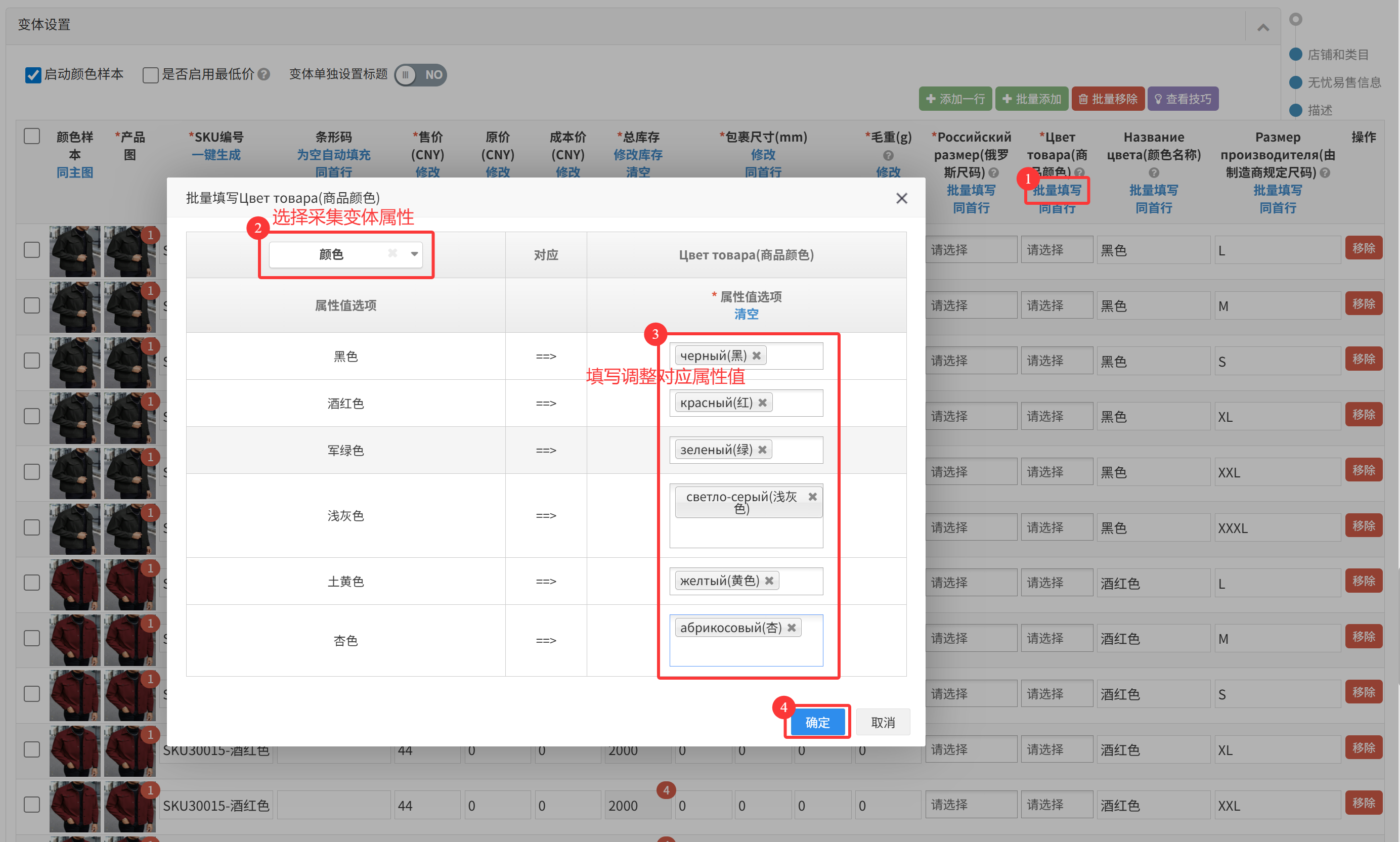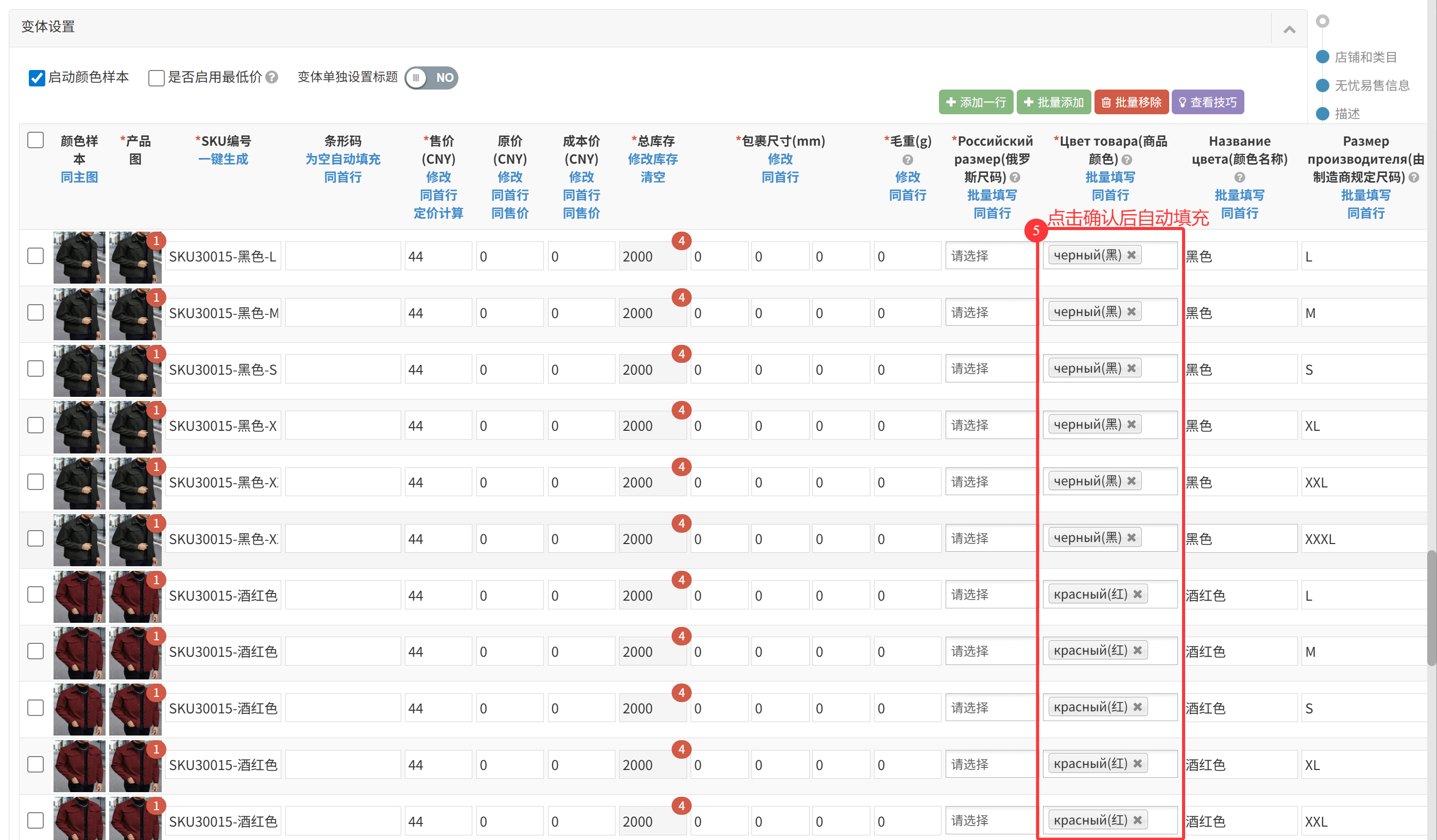 (10)批量填写:可以通过匹配采集属性,快速为所有变体批量填充属性值;