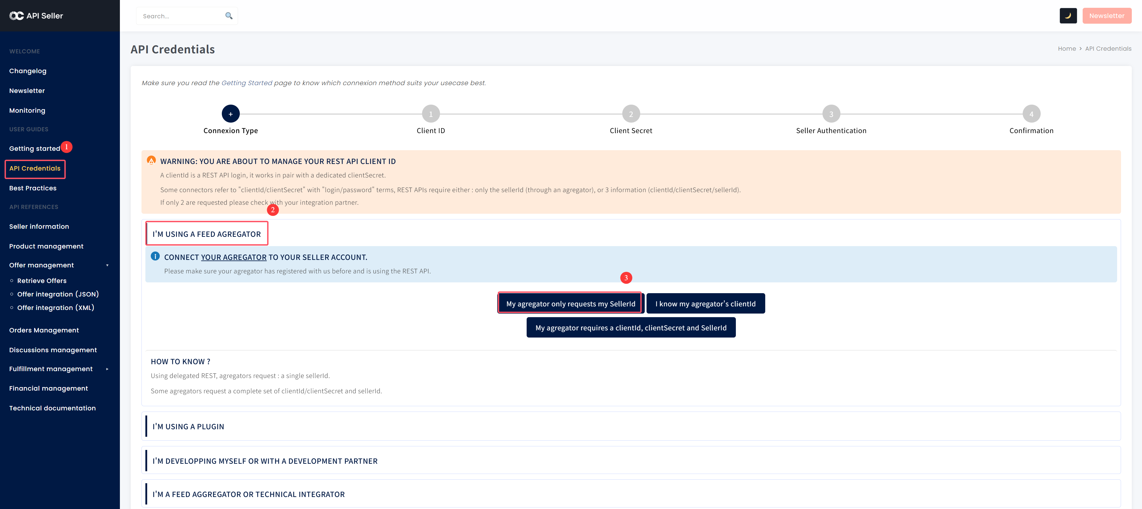 第二步:点击API Credentials > I'm using a feed agregator > My agregator only requests my SellerId