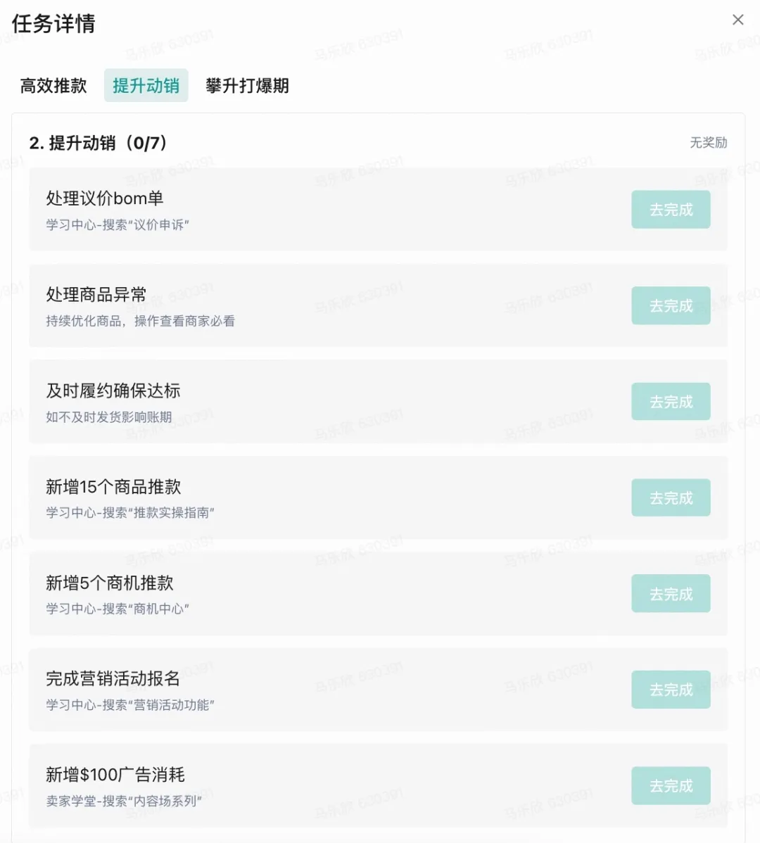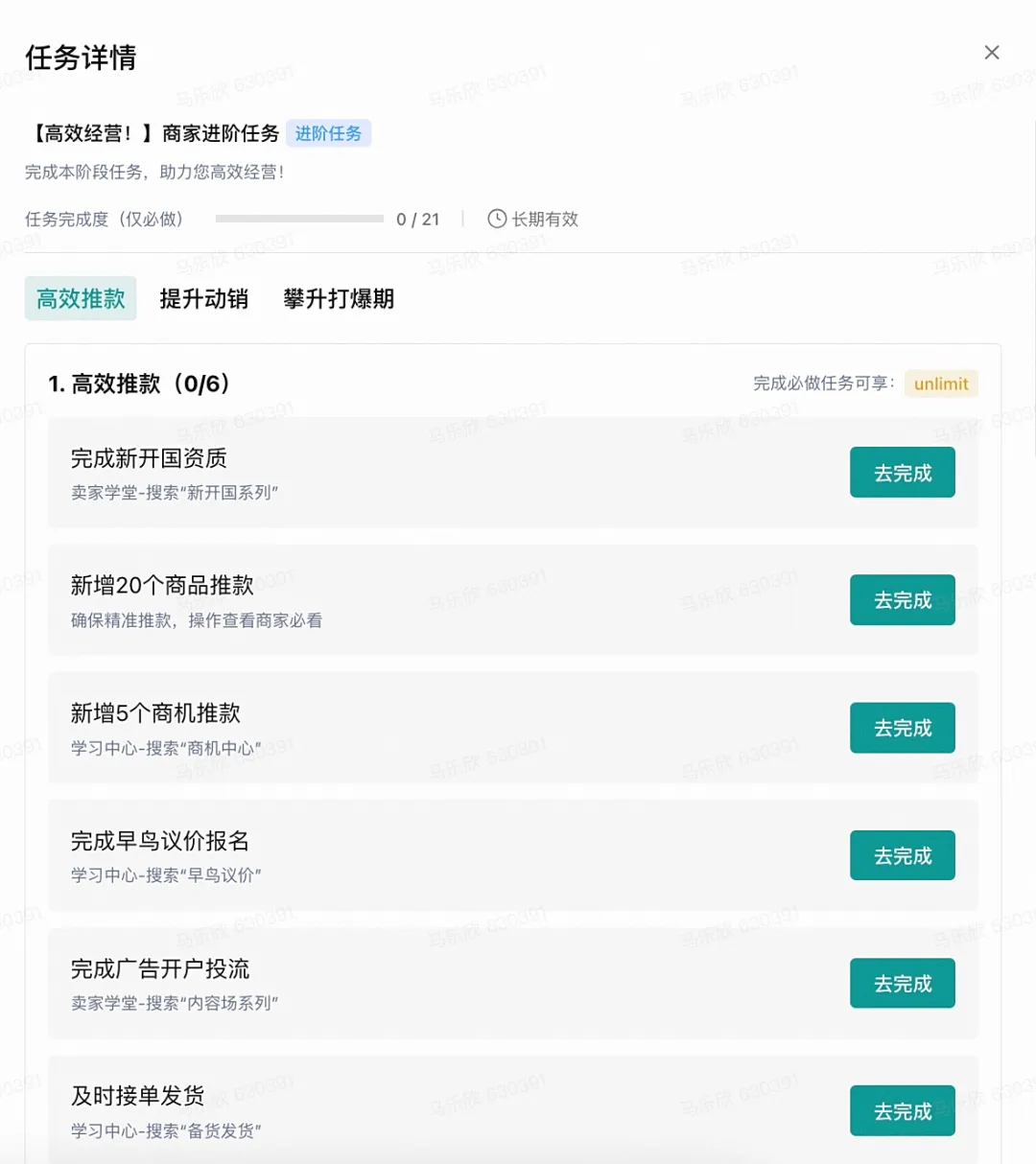 • 入驻15-30天:观看必学进阶课程、完成第二阶段进阶任务(精准推款、商品优化、营销活动报名等)