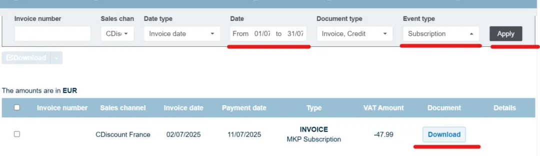Finance → Invoices→ 筛选“Date” 和“Subscription” 点击 Apply → Download 下载