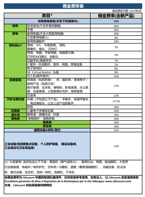Cdiscount 部分类目佣金率