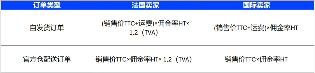 法国卖家计算佣金时,需要额外加上 20% TVA(即在佣金基础上 ×1,2);国际卖家则无需。