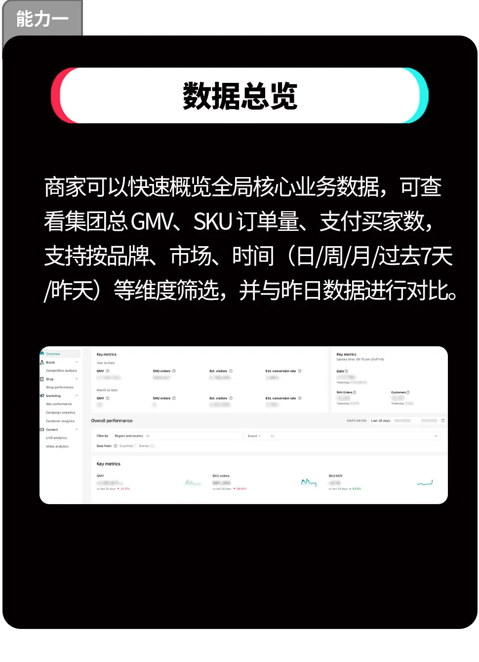 • 集团视角数据总览:一站式查看多个店铺的核心业绩指标(GMV、订单、买家数),快速掌握集团整体经营状况。