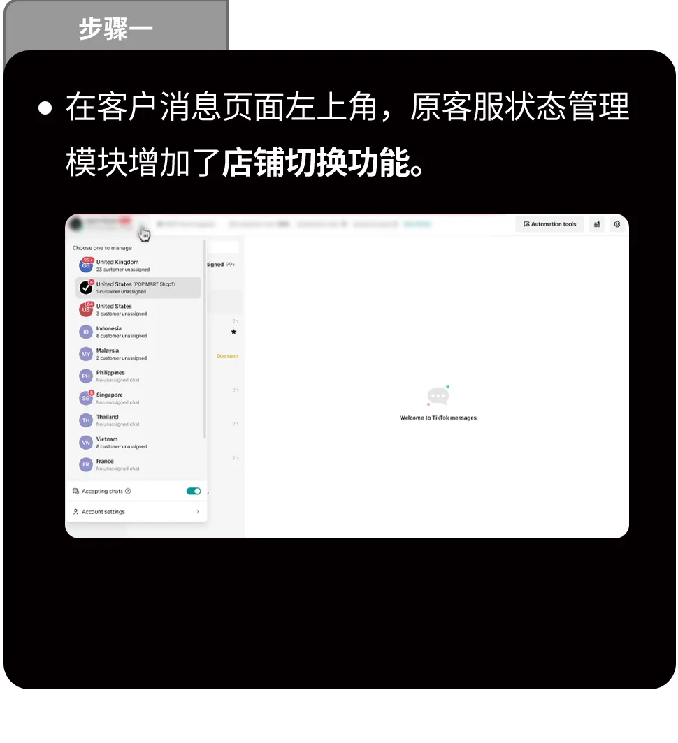 • 多店铺消息聚合:商家完成多店绑定后,商家客服可以在同一消息界面一键切换店铺,无需切换后台,集中处理各个店铺的买家消息。