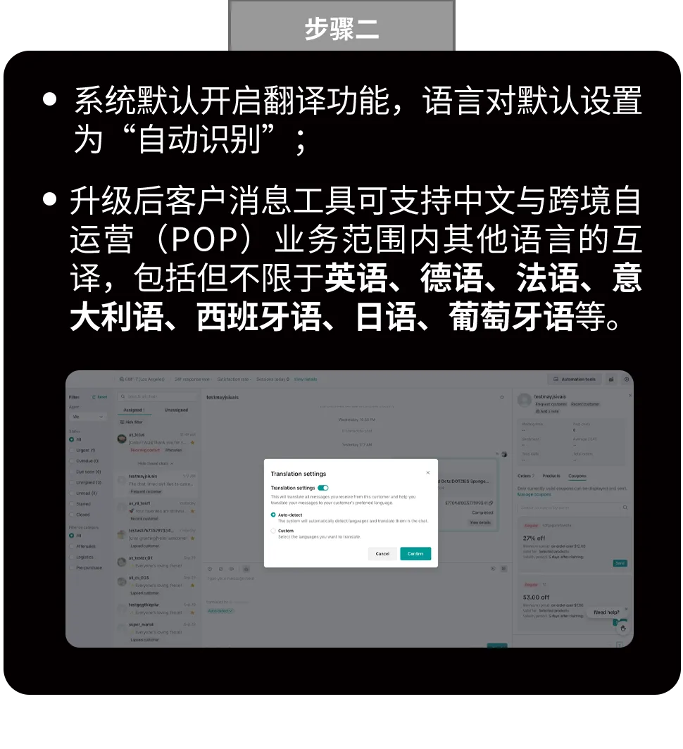 • 多语言实时互译:旧版客户消息工具仅支持客服输入英文,升级后可输入中文和其他语言,均支持相互翻译,帮助商家更顺畅地与全球买家沟通。